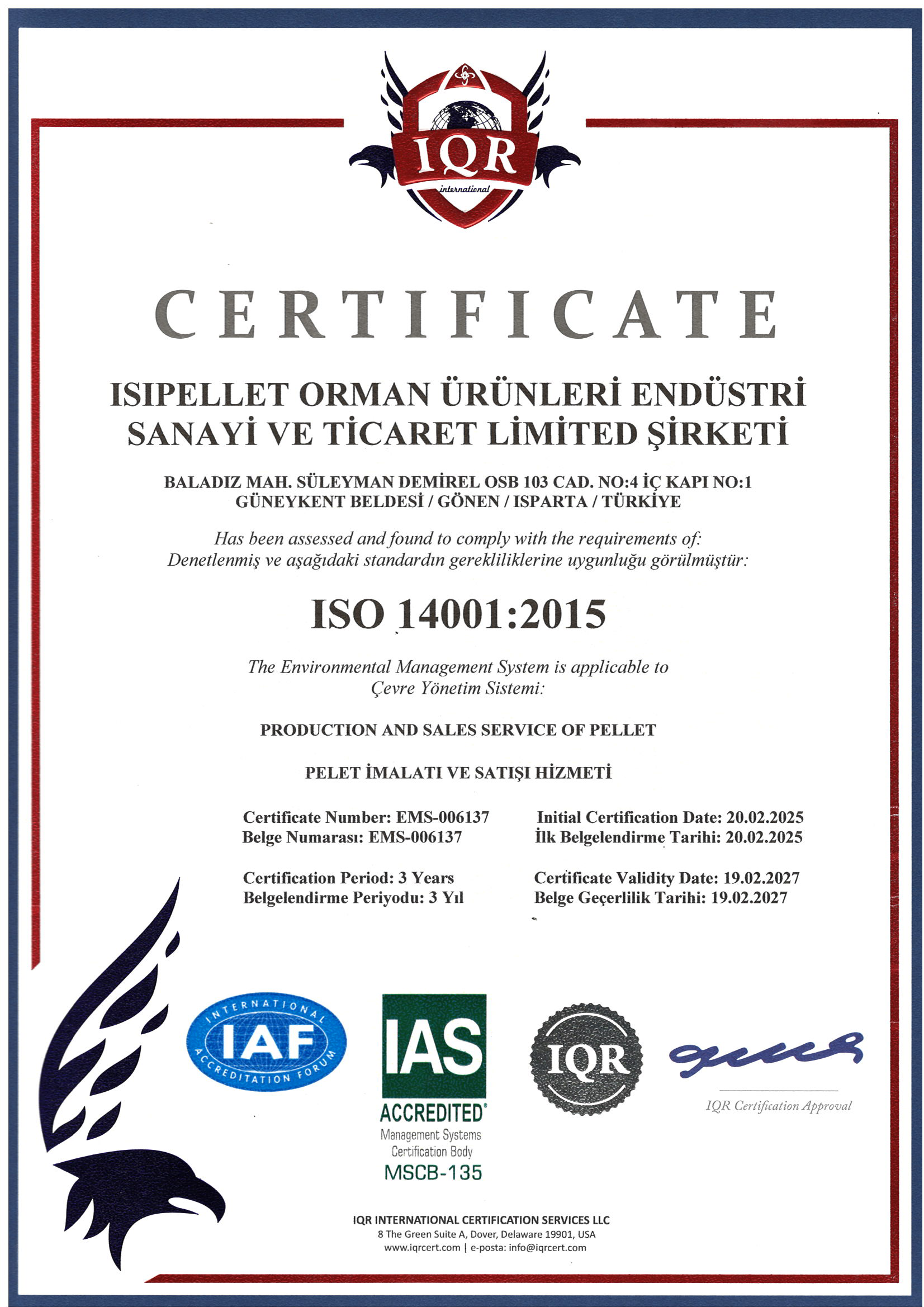 Üretim aşamalarında ISO 9001 ve ISO 14001 sertifikalarımız ile kaliteli pelet üretiyoruz.
